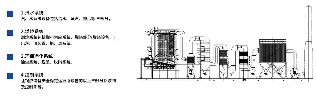 我公司生產(chǎn)的燃生物質(zhì)鍋爐采用散裝或半組裝結(jié)構(gòu)。鍋爐本體的前端為四周布置的膜式水冷壁,組成爐膛輻射受熱面,本體的后部布置對流蒸發(fā)受熱面。燃料在燃燒室燃燒后,高溫煙氣縱向沖刷垂直布置的爐膛膜式水冷壁,然后經(jīng)拉稀管組成的凝渣管束橫向沖刷對流受熱面,然后進入爐外單獨布置的尾部受熱面省煤器、空預器,最后進入環(huán)保設備進行煙氣凈化后排出。